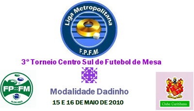 Ler mais3º Torneio Centro Sul de Futebol de Mesa Modalidade Dadinho 15 E 16 DE MAIO DE 2010 GINÁSIO DE ESPORTES